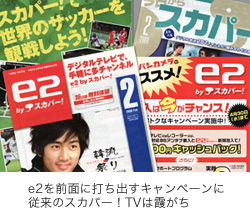 e2はBSデジタルの放送衛星と同方向に位置するために、同一アンテナでの受信が可能となる。このため地上・BS・CSのデジタル3波共用機(当初はBSとの2波)にe2チューナーが組み込まれた。スカパーは3波共用機の出荷が多く見込まれる年末商戦をにらんで、07年10月から人気タレントデュオ「WaT」を起用したe2のCMを地上波全国放送に流したのである。
