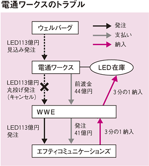 ウェルバーグと電通ワークスの担当者が、どうしても売り上げを立てたくて“見込み”で発注した。だが、無理だということになって電通ワークスはWWEにキャンセルを告げる。113億円のうち前渡金分の約44億円に発注をとどめ、それは在庫として抱え、時間をかけて処理することにした。しかし、そのつもりで事業計画を立てたWWEやエフティコミュニケーションズは納得しない。今は“フタ”をしているが、やがて民事刑事で告訴合戦になりそうだ。