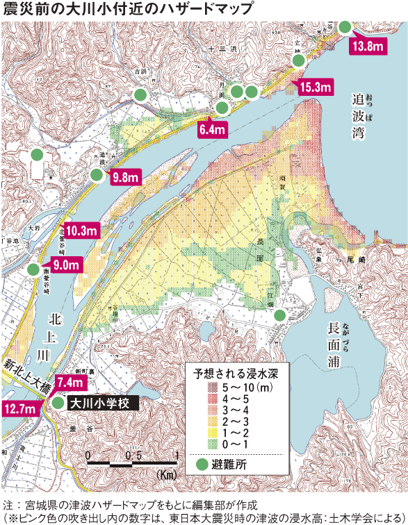 石巻市の当時の津波ハザードマップは、宮城県防災会議地震対策等専門部会が04年に連動型宮城県沖地震を想定して作成したものをほぼそのまま踏襲していた。図の中でいろいろな色で塗りつぶされた部分が、想定地震による津波浸水が予想されている領域である。こげ茶色の5m以上から緑色の1m未満まで6段階で表されており、左下の大川小学校はこの領域から外れているだけでなく、それをもって津波災害時の避難所に指定されてしまっていることが見て取れる。