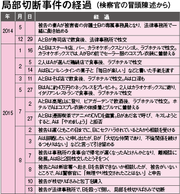 第2回公判で読み上げられた冒頭陳述は6ページ余りに短縮されていたが、内容は①2014年5月、被告の妻A(20代)は被害者の弁護士B(42)の専属事務員として、現場の法律事務所で働き始める、②同年12月、2人は寿司店で飲食後、事務所で性交、③今年1月にステーキ店、2月は鶏鍋店で飲食後、どちらもラブホテルで性交、④バレンタインデーには、Aが菓子と「毎日が楽しい」と書いた手紙をBに渡すなどと詳細だった。③の1月はカラオケボックスにも寄り、Aはセーラー服のコスプレ衣装に着替えた。