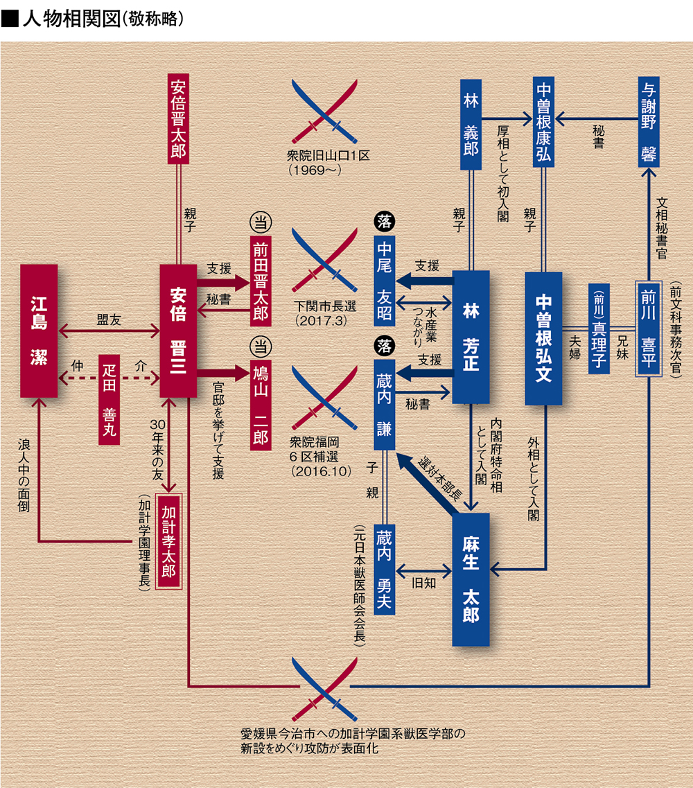 反安倍・加計の構図をみると、安倍包囲網の大きさがよくわかる。前川の実妹真理子は中曽根弘文元外相の妻。前川が秘書官を務めた文部大臣は5月に死去した与謝野馨であり、与謝野はかつて弘文の父、中曽根康弘元首相の秘書だった。ちなみに林の父・義郎は中曽根内閣に厚生相として初入閣している。複雑にからみ合う人脈はつながっているのだ。(敬称略)