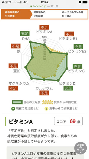 「パーソナルワン」を利用するには、ファンケルのホームページから「食習慣・生活習慣に関するWEBアンケート」(全45問)に回答して尿検査キットを申し込む。採尿し、尿検体を投函すると約1週間後に分析結果のメールが届く。専用ページ「パーソナルワン マイラウンジ」では、栄養素の充足度がレーダーチャートと点数(100点満点)で示され、医師監修のもと開発された分析ロジックに基づき、最適なサプリメントが提案される。その内容は、あなたに必要なビタミン、ミネラルなどの基本栄養素で設計された「ベースサプリ」と、代謝の低下、腸内環境、睡眠など複数のお悩みにアプローチする「健康悩み対策サプリ」の組み合わせからなる。