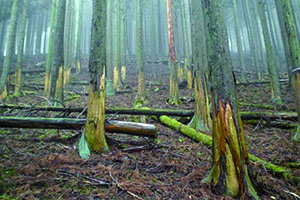 スギ人工林におけるシカの剥皮被害(滋賀県多賀町、林野庁HPより)