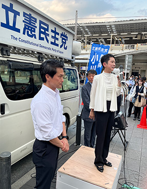 公認後初の街頭演説を行った「ニュー蓮舫」。手前は立憲民主党の小川純也幹事長。(6月27日、東京の自由が丘駅前で)